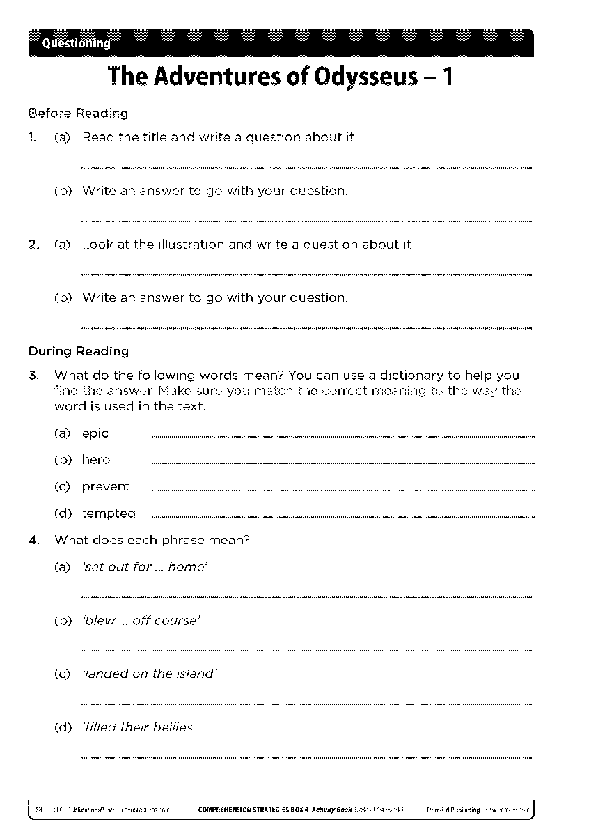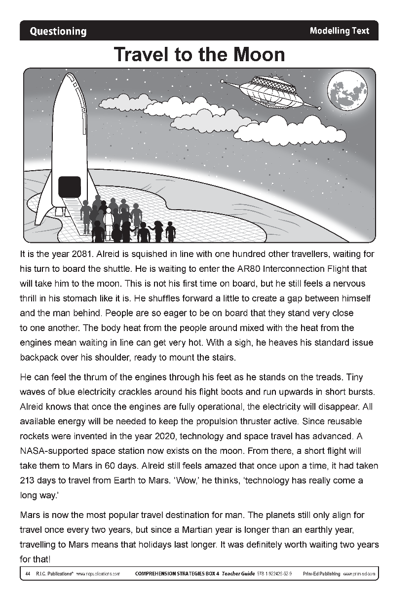 The teacher should use the modelling text provided to introduce and demonstrate the questioning comprehension strategy to their class. The illustrated text should be displayed onto an interactive whiteboard, to enable the teacher to conceal and reveal parts of the text to the children, and highlight text and add annotations as appropriate. The steps the teacher should go through to model and teach the strategy are clearly laid out in the teacher notes. The modelling is oral and includes what the teacher should say at various stages of reading the text; for example, the title, the first paragraph, and so on. To start, the strategy is explained, before the children are directed to look at the illustration and answer questions about it. Children are then asked questions about the title, before reading the text and being asked questions at various points, to enable them to better understand it. The questions to be modelled are a variety of literal, inferential and evaluative questions.
