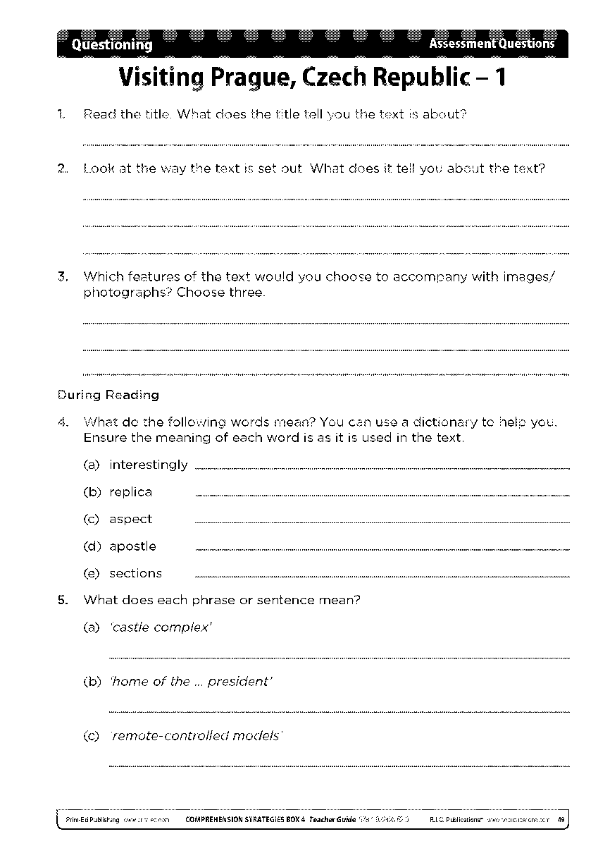 The teacher can use the assessment text in the teacher guide and the corresponding assessment questions to assess how well each child has understood and can use the questioning comprehension strategy.